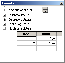 Each remote panel represents a single virtual Modbus device. Each device has its own Modbus address set with the spin control at the top of the panel. The device will respond to all read and write requests directed to this address.