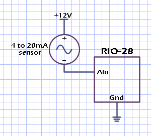 Analog inputs can sense a range of 0 to 20 mA. Here is a typical configuration that uses the analog input to monitor the current through a sensor.