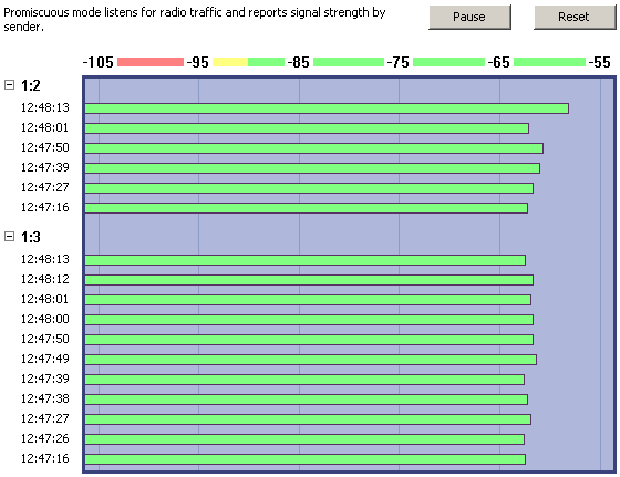 The promiscuous survey is a good test to monitor the health of a running system. The test listens for packets and displays the received signal strengths of the transmissions.